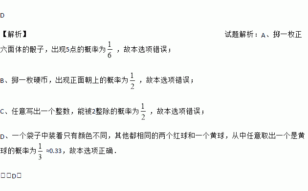 D. 一个袋子中装着只有颜色不同,其他都相同的两个红球和一个黄球,从中任意取出一个是黄球的概率