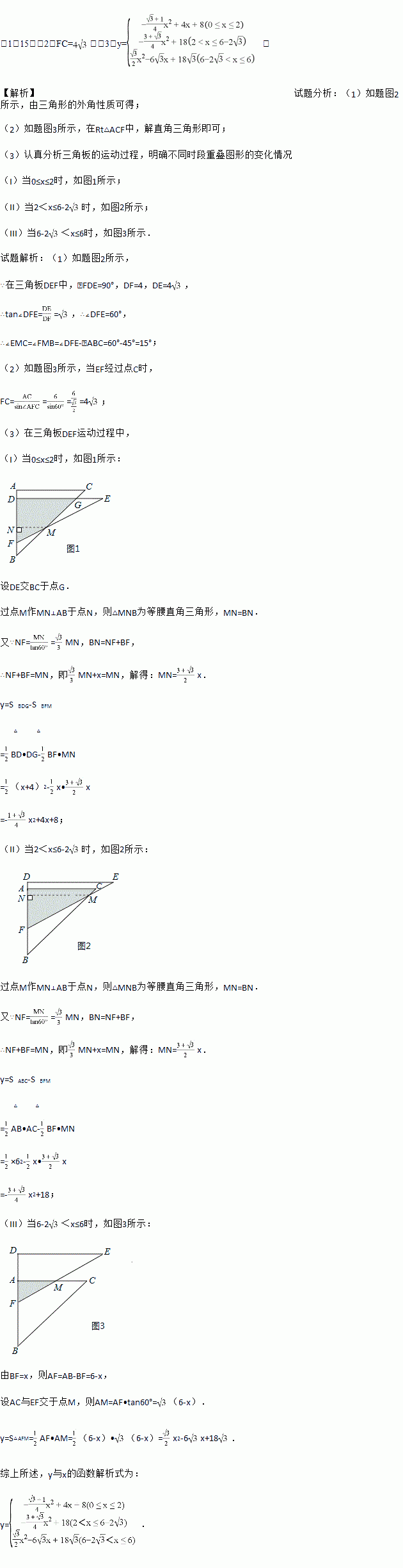 (3)在三角板DEF运动过程中,设BF=x,两块三角板重叠部分的面积为y,求y与x的函数解析式,并求出对应的x取值范围.