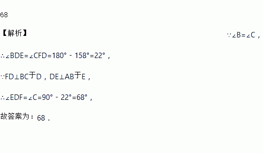 如图,△ABC中,∠B=∠C,FD⊥BC于D,DE⊥AB于E,∠AFD=158°,则∠EDF等于_____度.