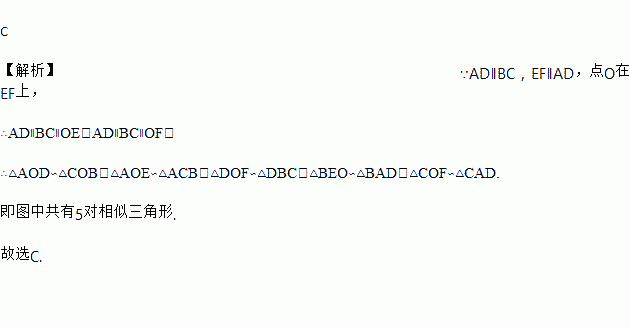 C 【解析】∵AD∥BC,EF∥AD,点O在EF上, ∴AD∥BC∥OE,AD∥BC∥OF, ∴△AOD∽△COB,△AOE∽△ACB,△DOF∽△DBC,△BEO∽△BAD,△COF∽△CAD. 即图中共有5对相似三角形. 故选C.