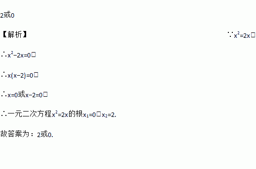 2或0 【解析】∵x2=2x, ∴x2?2x=0, ∴x(x?2)=0, ∴x=0或x?2=0, ∴一元二次方程x2=2x的根x1=0,x2=2. 故答案为:2或0.