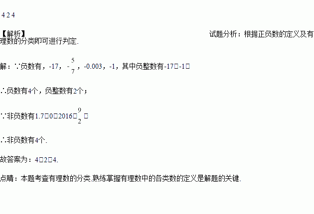 有理数1.7,-17,0,,-0.003,2016,和-1中,负数有___________个,负整数有___________个,非负数有___________个.