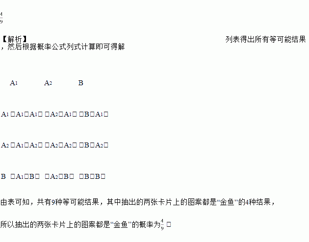 剪纸是中国传统的民间艺术,它画面精美,风格独特,深受大家喜爱,现有三张不透明的卡片,其中两张卡片的正面图案为“金鱼”,另外一张卡片的正面图案为“蝴蝶”,卡片除正面剪纸图案不同外,其余均相同.将这三张卡片背面向上洗匀从中随机抽取一张,记录图案后放回,重新洗匀后再从中随机抽取一张.请用画树状图(或列表)的方法,求抽出的两张卡片上的图案都是“金鱼”的概率.(图案为“金鱼”的两张卡片分别记为A1、A2,图案为“蝴蝶”的卡片记为B)