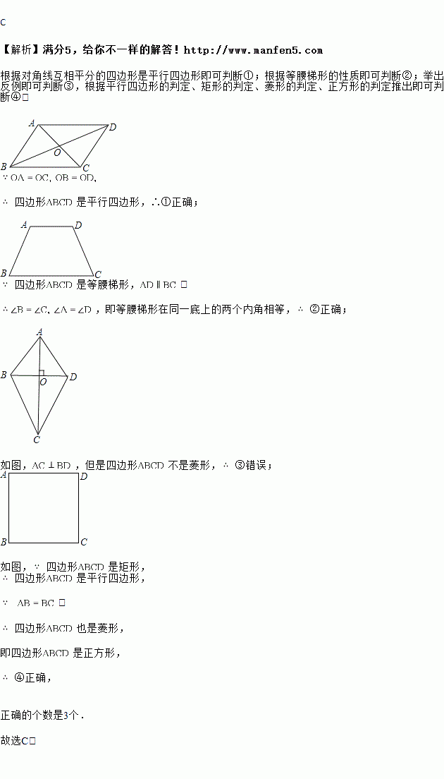 ①对角线互相平分的四边形是平行四边形; ②等腰梯形在同一底上的两个内角相等;