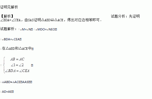 已知△ABN和△ACM位置如图所示,AB=AC,∠1=∠2,∠M=∠N.求证:AD=AE.