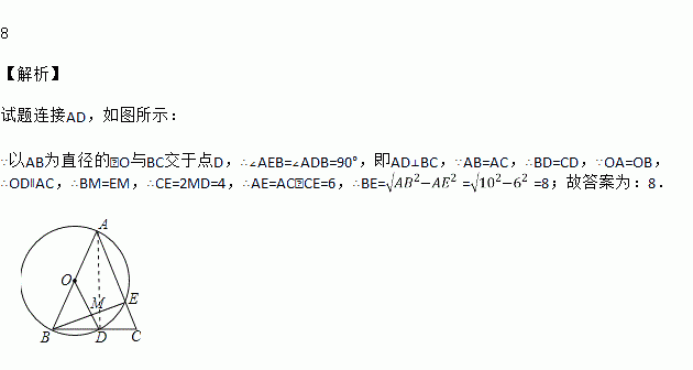 如图,在△ABC中,AB=AC=10,以AB为直径的⊙O与BC交于点D,与AC交于点E,连OD交BE于点M,且MD=2,则BE的长为____.