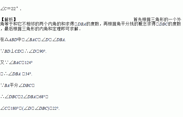 如图,在△DBC中,BD⊥CD,BA平分∠DBC,∠BAC=124°,求∠C的度数.