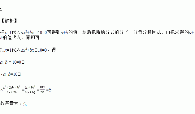 已知x=1是一元二次方程ax2+bx﹣10=0的一个根,则分式的值为_____.