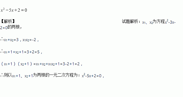 x1、x2为方程x2-3x-2=0的两根,则以x1+1、x2+1为两根的一元二次方程为________