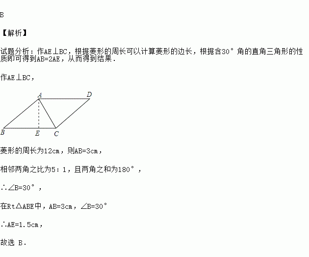 B 【解析】 试题分析:作AE⊥BC,根据菱形的周长可以计算菱形的边长,根据含30°角的直角三角形的性质即可得到AB=2AE,从而得到结果. 作AE⊥BC, 菱形的周长为12cm,则AB=3cm, 相邻两角之比为5:1,且两角之和为180°, ∴∠B=30°, 在Rt△ABE中,AB=3cm,∠B=30° ∴AE=1.5cm, 故选 B.