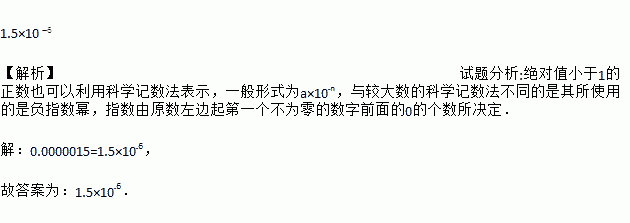 1.5×10 【解析】试题分析:绝对值小于1的正数也可以利用科学记数法表示,一般形式为a×10﹣n,与较大数的科学记数法不同的是其所使用的是负指数幂,指数由原数左边起第一个不为零的数字前面的0的个数所决定. 【解析】 0.0000015=1.5×10﹣6, 故答案为:1.5×10﹣6.