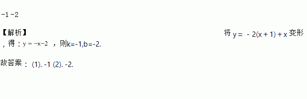 在一次函数y=-2(x+1)+x中,比例系数k为___,常数项b为___.