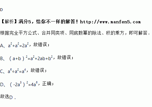 A. a2+a2=a4 B. (a+b)2=a2+b2 C. a6÷a2=a3 D. (﹣2a3)2=4a6