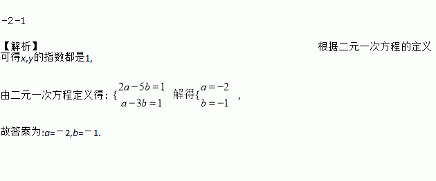 -2 -1 【解析】根据二元一次方程的定义可得x,y的指数都是1, 由二元一次方程定义得: , 故答案为:a=-2,b=-1.