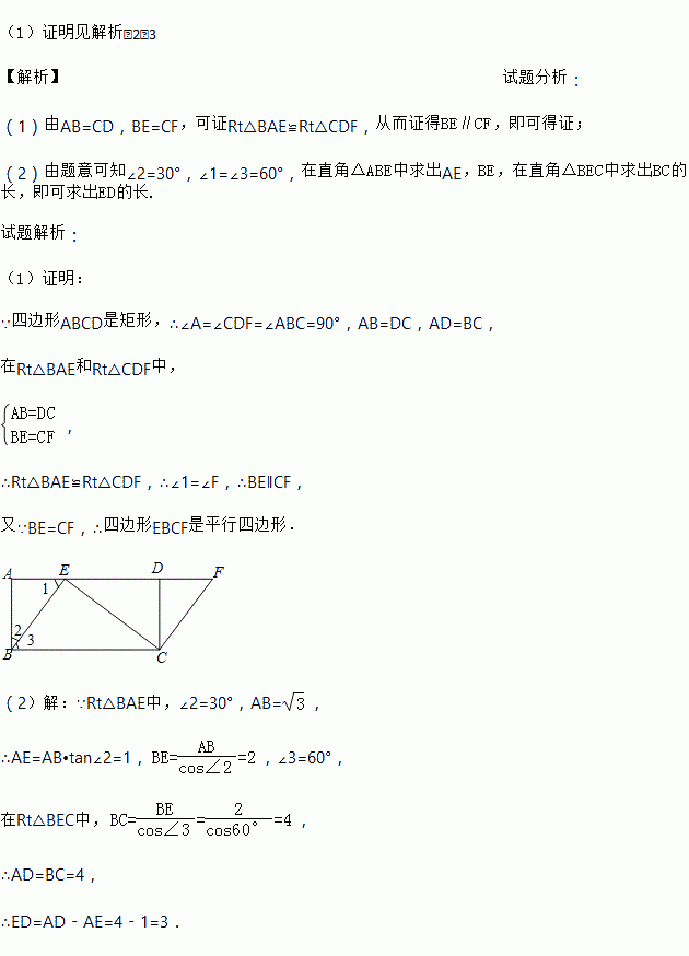 (2)若∠BEC=90°,∠ABE=30°,AB=,求ED的长.