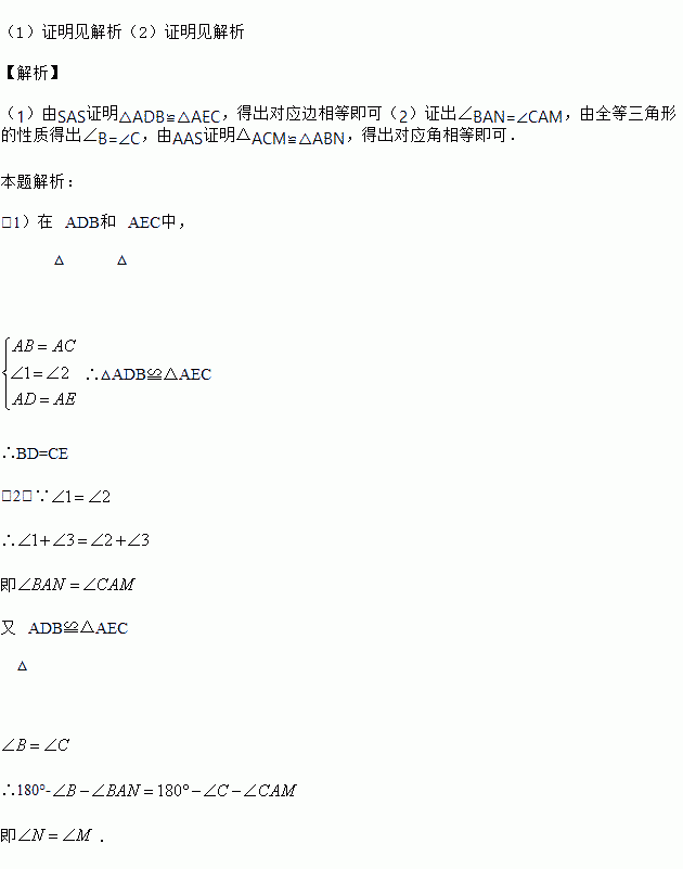 已知△ABN和△ACM的位置如图所示,AB=AC,AD=AE,∠1=∠2.