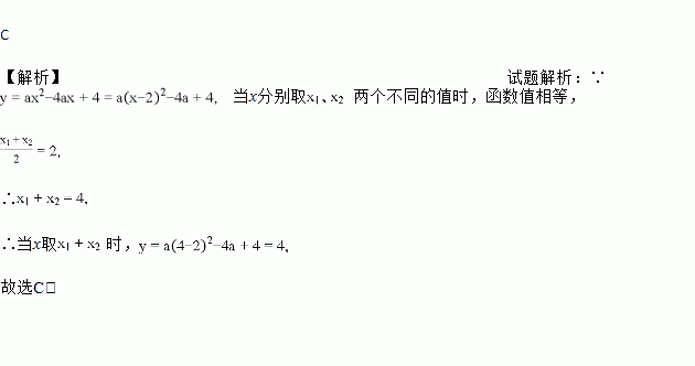 已知二次函数y=ax2﹣4ax+4,当x分别取x1、x2两个不同的值时,函数值相等,则当x取x1+x2时,y的值为( )