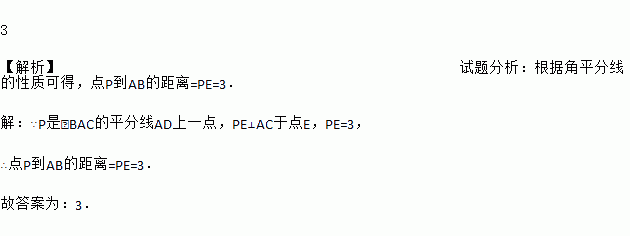 如图,点P是∠BAC的平分线AD上一点,PE⊥AC于点E.若PE=3,则点P到AB的距离是 .