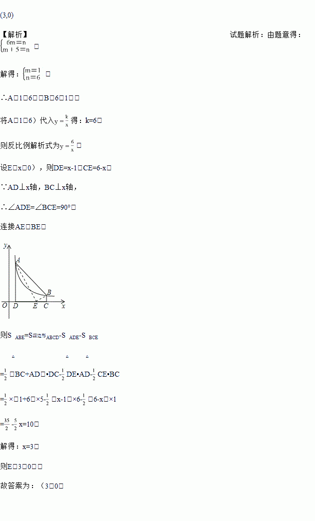 如图,点A(m,6),B(n,1)在反比例函数的图象上,AD⊥x轴于点D,BC⊥x轴于点C,点E在CD上,CD=5,△ABE的面积为10,则点E的坐标是_____________.