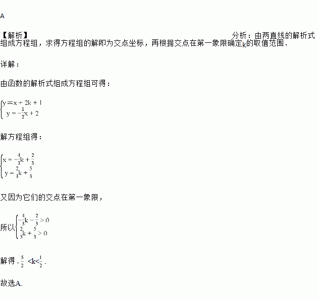 若直线 y = x +2k +1与直线y= x+2 的交点在第一象限,则 k 的取值范围是( )
