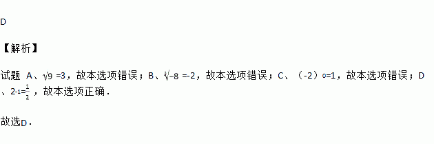 A. =±3 B. =2 C. (﹣2)0=0 D. 2﹣1=