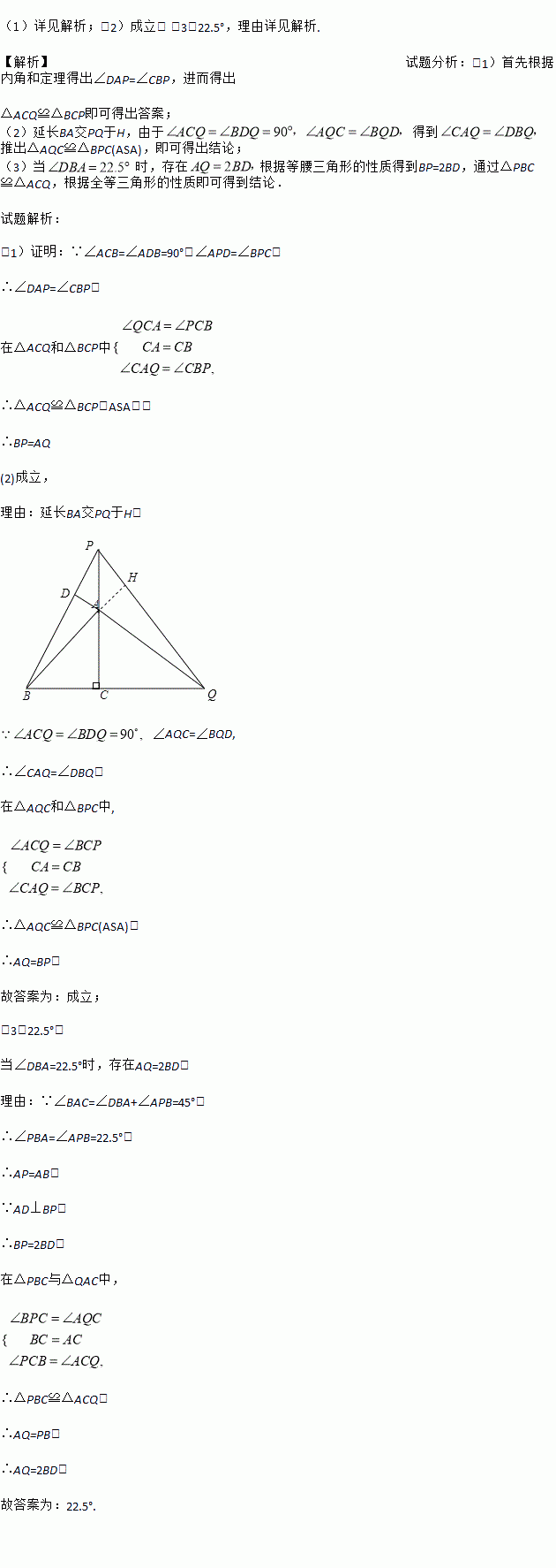 (1)详见解析;(2)成立; (3)22.5°,理由详见解析. 【解析】试题分析:(1)首先根据内角和定理得出∠DAP=∠CBP,进而得出 △ACQ≌△BCP即可得出答案; (2)延长BA交PQ于H,由于 得到 推出△AQC≌△BPC(ASA),即可得出结论; (3)当时,存在根据等腰三角形的性质得到BP=2BD,通过△PBC≌△ACQ,根据全等三角形的性质即可得到结论. 试...