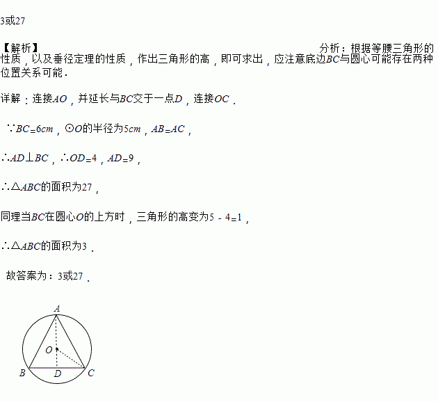 等腰三角形ABC的底边BC=6,△ABC的外接圆⊙O的半径为5,则S△ABC=_____.