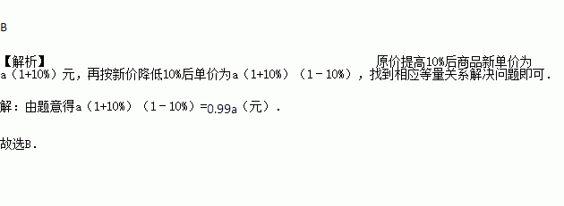 某商品的批发价为a元,先提高10%零售,后又按零售价降低10%出售,则它最后的单价是( )元.