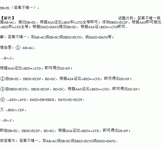 如图,在△ABC中,D是BC边上的中点,∠BDE=∠CDF,请你添加一个条件,使DE=DF成立.你添加的条件是 .(不再添加辅助线和字母)