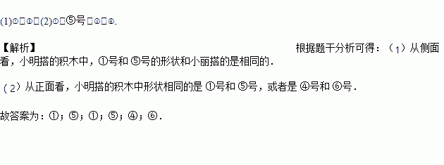 (1)从侧面看,小明搭的积木中, 号和 号的形状和小丽搭的是相同的.