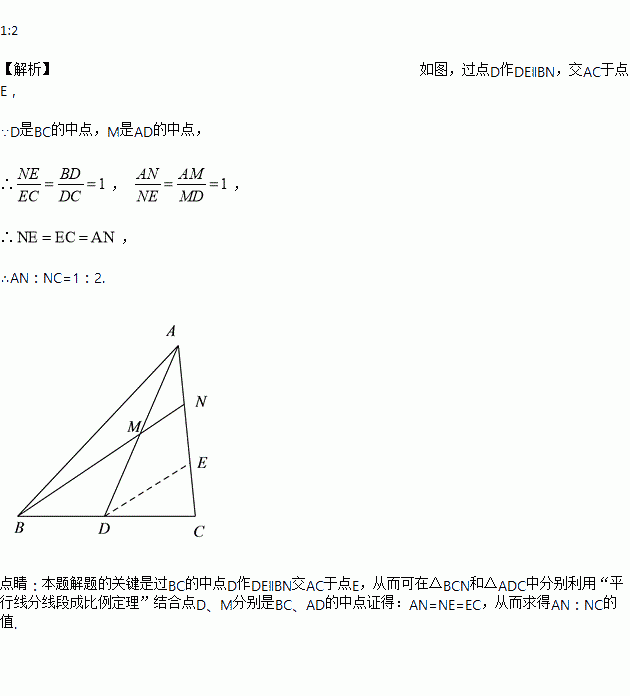 如图,D是BC的中点,M是AD的中点,BM的延长线交AC于N,则AN:NC=________。