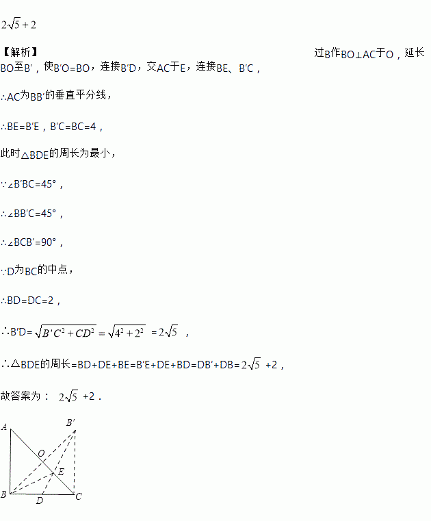 如图,在Rt△ABC中,AB=BC=4,D为BC的中点,在AC边上存在一点E,连接ED,EB,则△BDE周长的最小值为________.
