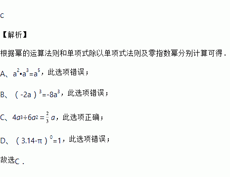 A. a2•a3=a6 B. (﹣2a)3=﹣6a3 C. D. (3.14﹣π)0=0
