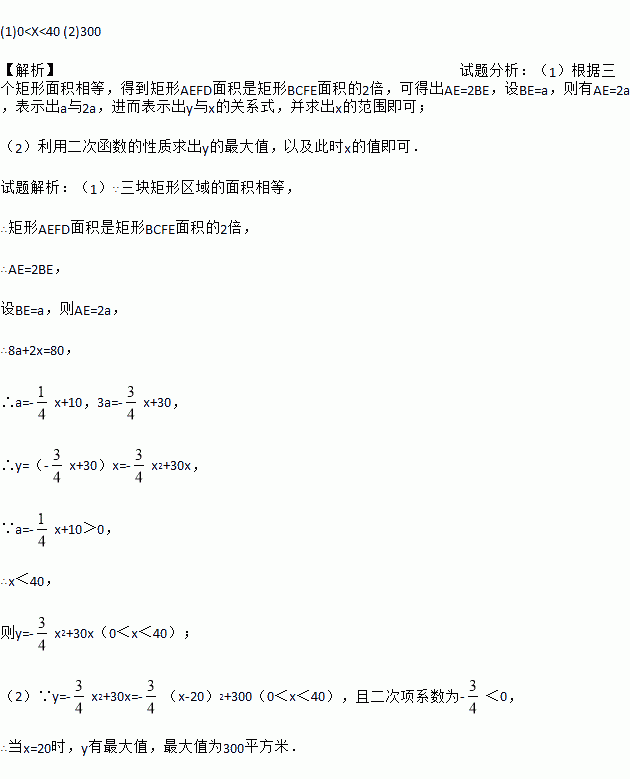 为了节省材料,某水产养殖户利用水库的岸堤(岸堤足够长)为一边,用总长为80m的围网在水库中围成了如图所示的①②③三块矩形区域,而且这三块矩形区域的面积相等.设BC的长度为xm,矩形区域ABCD的面积为ym 2 .