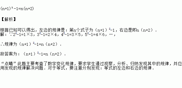 观察下列各式,探索发现规律:22-1=1×3;32-1=2×4;42-1=3×5;52-1=4×6;….按此规律,第n个等式为__