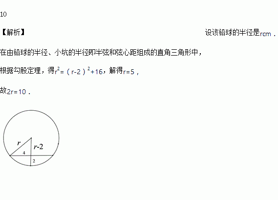 若小唐同学掷出的铅球在场地上砸出一个直径约为8cm、深约为2cm的小坑,则该铅球的直径约为__________cm