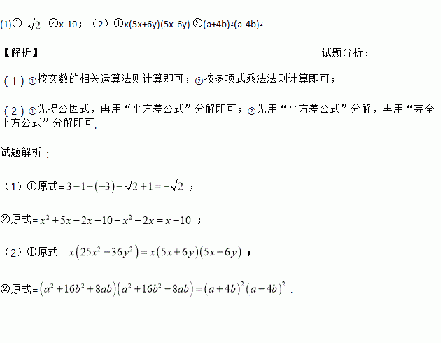 (1)①- ②x-10;(2)①x(5x+6y)(5x-6y) ②(a+4b)2(a-4b)2 【解析】试题分析: (1)①按实数的相关运算法则计算即可;②按多项式乘法法则计算即可; (2)①先提公因式,再用“平方差公式”分解即可;②先用“平方差公式”分解,再用“完全平方公式”分解即可. 试题解析: (1)①原式=; ②原式=; (2)①原式= ; ...