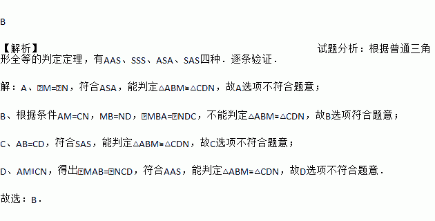 A. ∠M=∠N B. AM=CN C. AB=CD D. AM∥CN