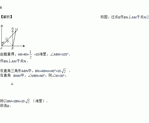 上午9时,一条船从A处出发,以每小时40海里的速度向正东方向航行,9时30分到达B处