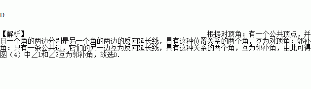 C. 图(3)中∠1和∠2是一对邻补角 D. 图(4)中∠1和∠2互为邻补角