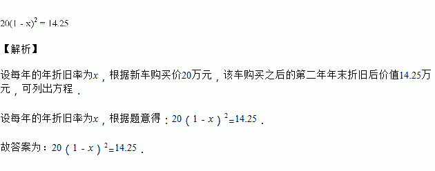 一辆汽车,新车购买价万元,每年的年折旧率为,如果该车购买之后的第二年年末折旧后价值万元,求年折旧率的值.根据题意,可列出关于的方程为________(列出方程即可,无需求解).
