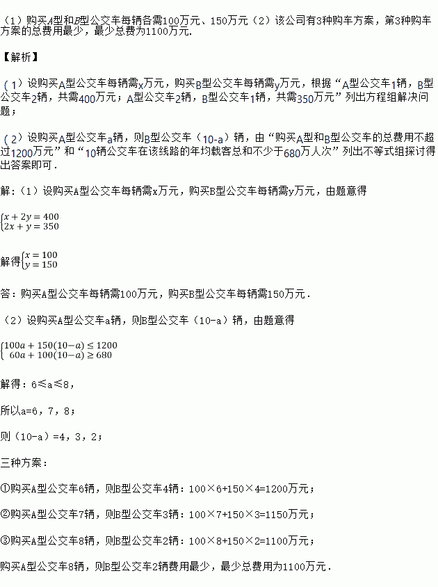 (2)预计在该线路上A型和B型公交车每辆年均载客量分别为60万人次和100万人次.若该公司购买A型和B型公交车的总费用不超过1200万元,且确保这10辆公交车在该线路的年均载客总和不少于680万人次,则该公司有哪几种购车方案?哪种购车方案总费用最少?最少总费用是多少?