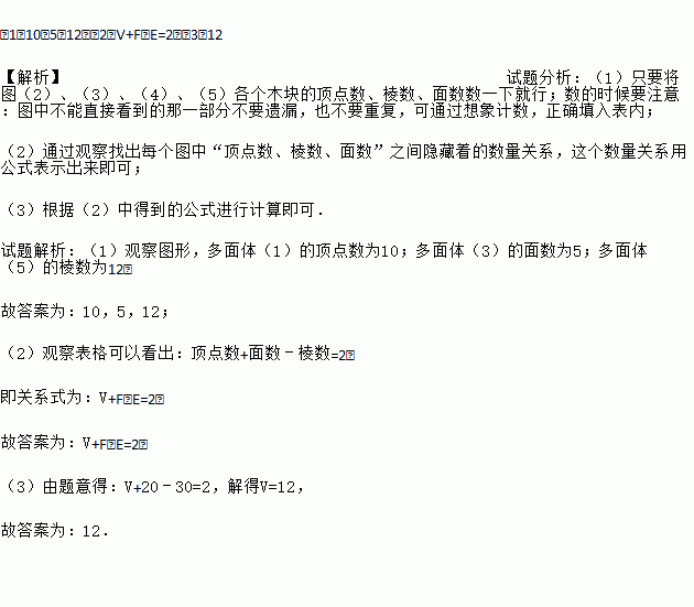 (2)猜想:一个多面体的V(顶点数),F(面数),E(棱数)之间的数量关系是 ;