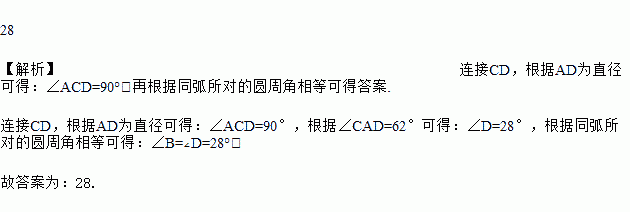 如图,△ABC的三个顶点都在⊙O上,AD是直径,且∠CAD=62°,则∠B的度数为_______.