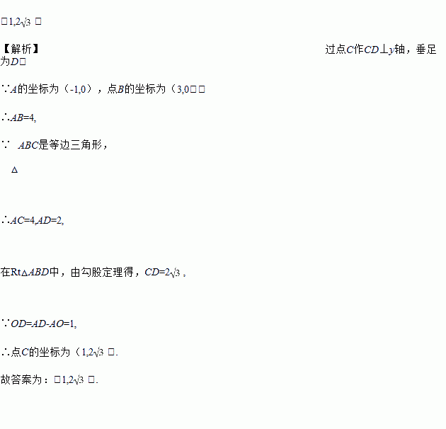 如图,在平面直角坐标系中,△ABC是等边三角形,且点A的坐标为(-1,0),点B的坐标为(3,0),则点C的坐标为___________