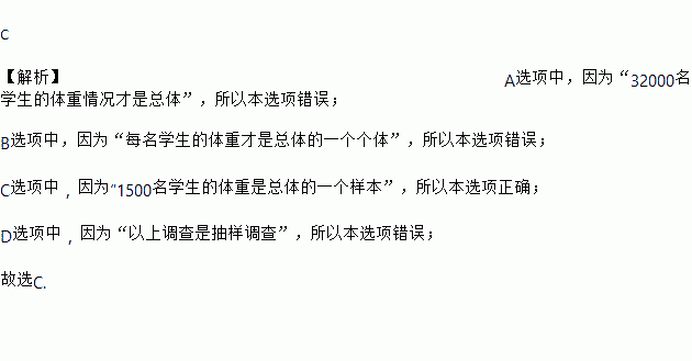 C 【解析】A选项中,因为“32000名学生的体重情况才是总体”,所以本选项错误; B选项中,因为“每名学生的体重才是总体的一个个体”,所以本选项错误; C选项中,因为“1500名学生的体重是总体的一个样本”,所以本选项正确; D选项中,因为“以上调查是抽样调查”,所以本选项错误; 故选C.