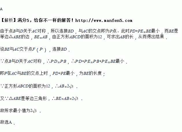 如图所示,正方形ABCD的面积为12,△ABE是等边三角形,点E在正方形内,在对角线AC上找到一点P,使PD+PE的和最小,则这个和的最小值是( ).