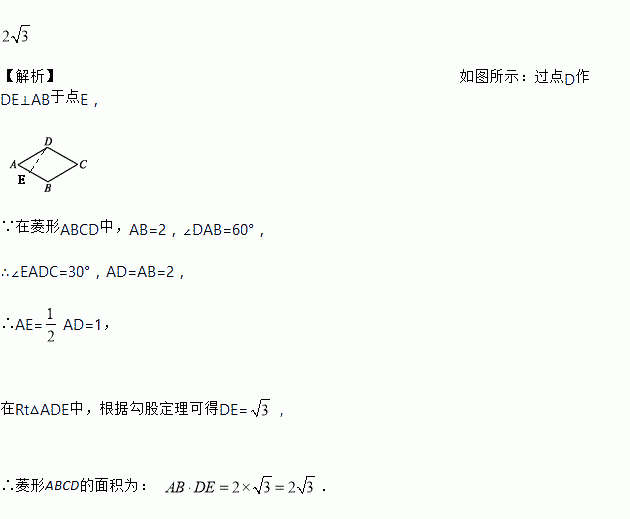 如图,在菱形ABCD中,∠DAB=60°,AB=2,则菱形ABCD的面积为 .