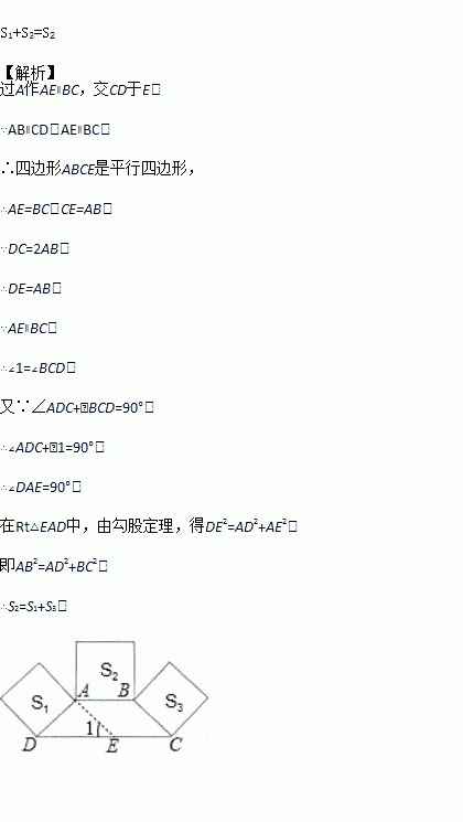 如图,如图,梯形中, , ,且,分别以DA,AB,BC为边向梯形外作正方形,其面积分别为S1,S2,S3,则S1,S2,S3之间的关系是_______.