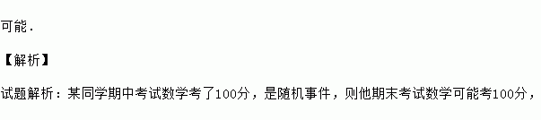 某同学期中考试数学考了100分,则他期末考试数学 考100分.(选填“不可能”“可能"或 “必然”)